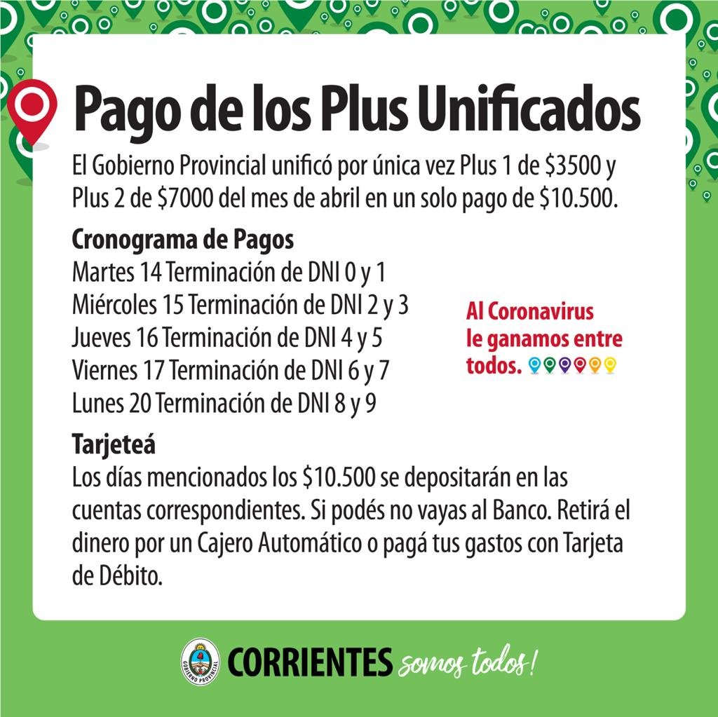 Tal como se informara oportunamente, este martes comienza el pago unificado de los plus 1 y 2 correspondientes al mes de abril para activos...