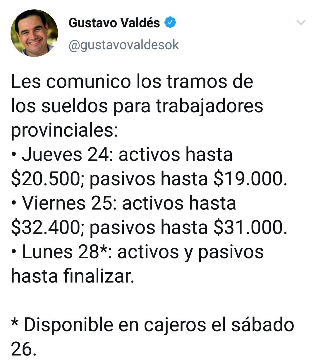 El gobernador Gustavo Valdés anunció hoy el cronogama de la liquidación de haberes de este mes para trabajadores provinciales activos y pasivos, a través de su...