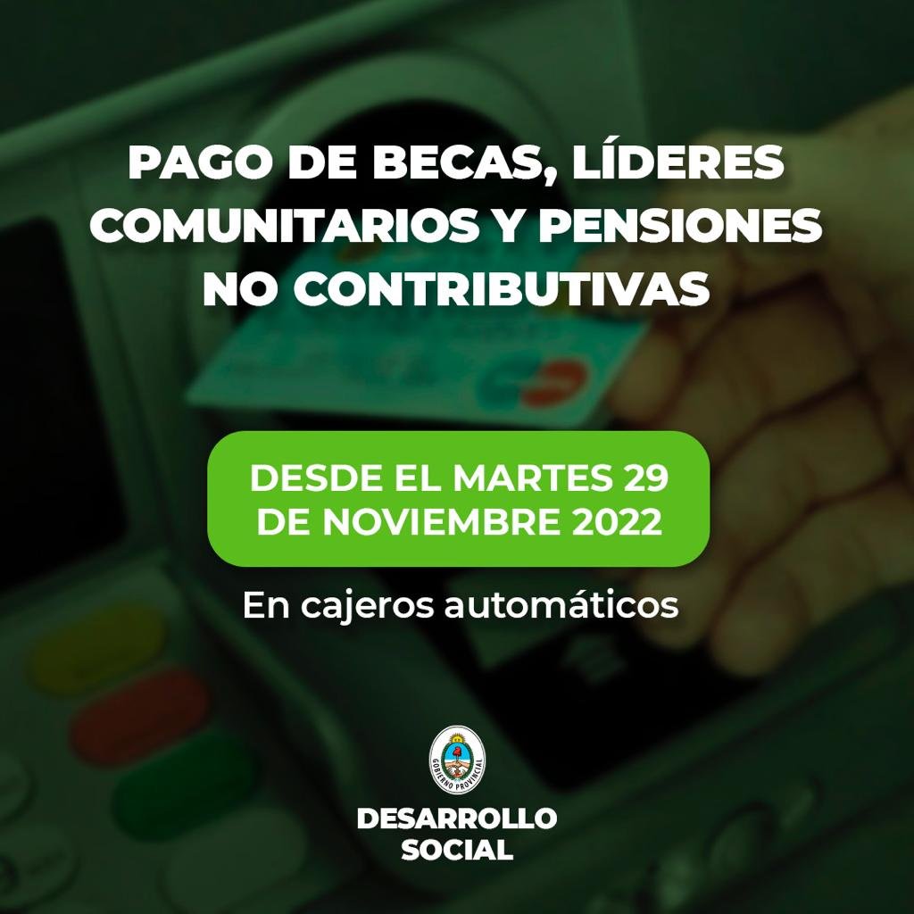 El Ministerio de Desarrollo Social de la Provincia, informa a beneficiarios, que desde este martes 29 de noviembre del 2022, estará disponible el pago de Becas, Pensiones...