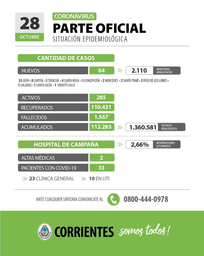 En cuanto al fallecimiento con resultado positivo para Covid-19 de la fecha, se trata de un hombre de 71 años de Saladas con antecedente de hipertensión.