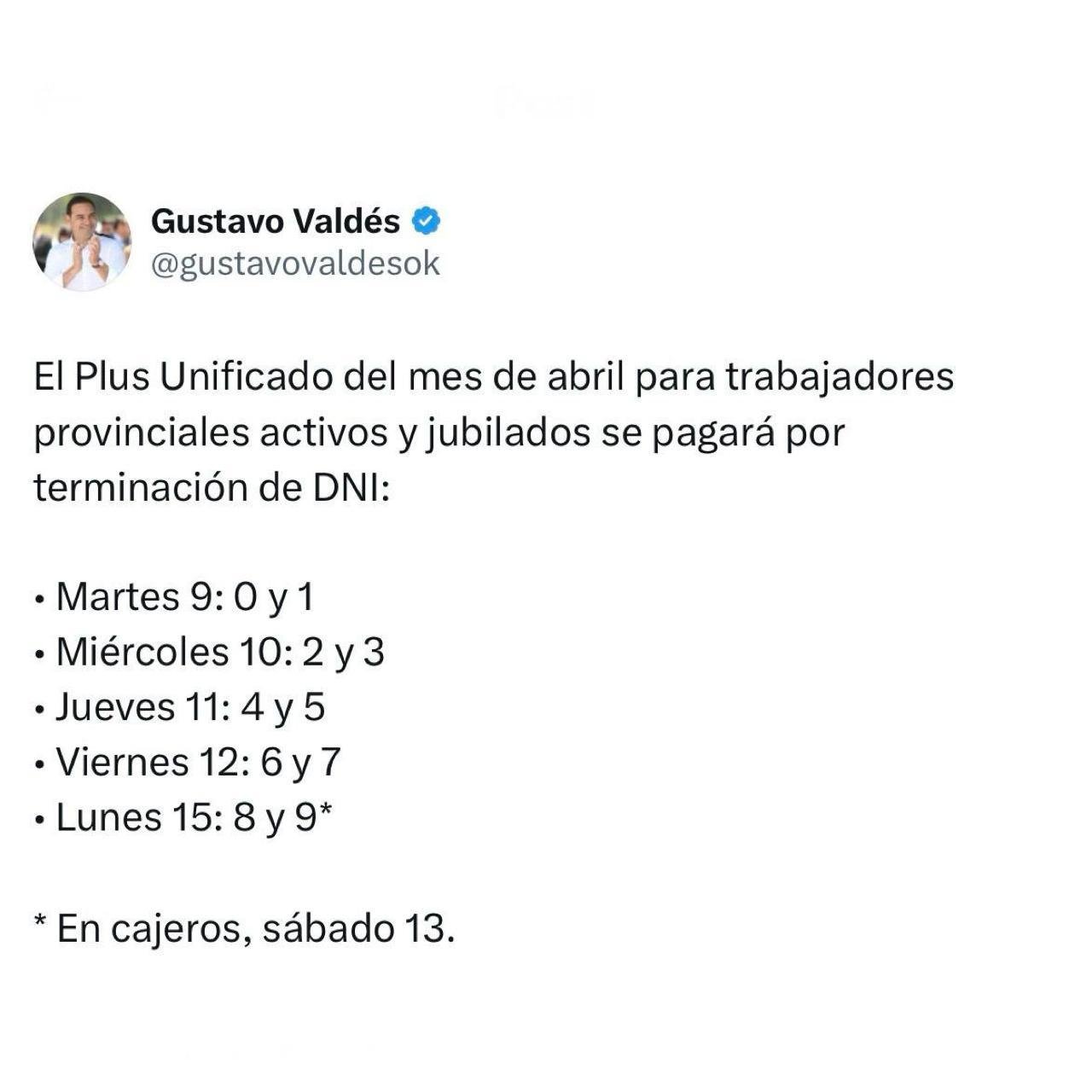El gobernador Gustavo Valdés informó, a través de su cuenta de Twitter, el cronograma para el pago de los sueldos de agosto a trabajadores provinciales activos y pasivos, que dará inicio el martes 25 del corriente mes para aquellos que tengan el Documento Nacional de Identidad (DNI) finalizado en 0 y 1.
